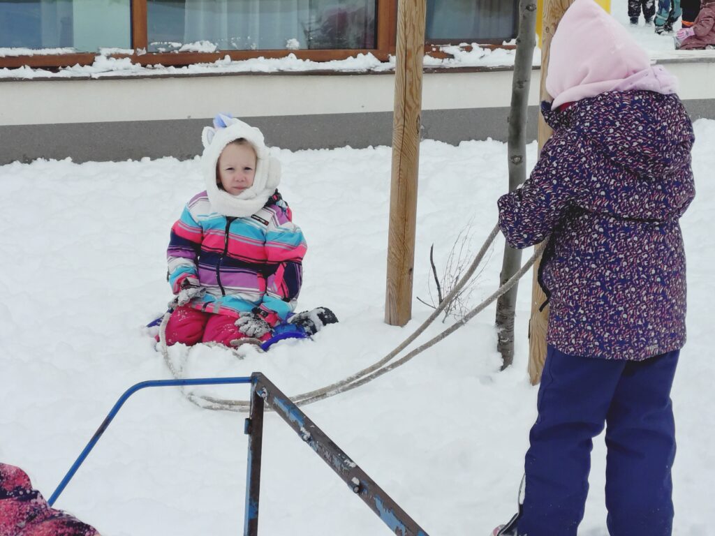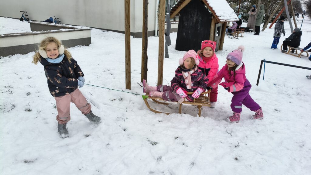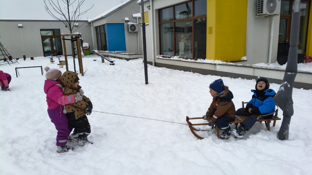 A hóban nem maradhatott el a hóangyal készítése, és a havas napok egyik legnagyobb öröme a szánkózás sem. A szánkózás nemcsak móka, jó alkalom a fejlődésre is, hiszen erősíti a gyerekek egyensúlyérzékét, megtanítja őket az együttműködésre, hiszen gyakran egymást húzzák, segítik.