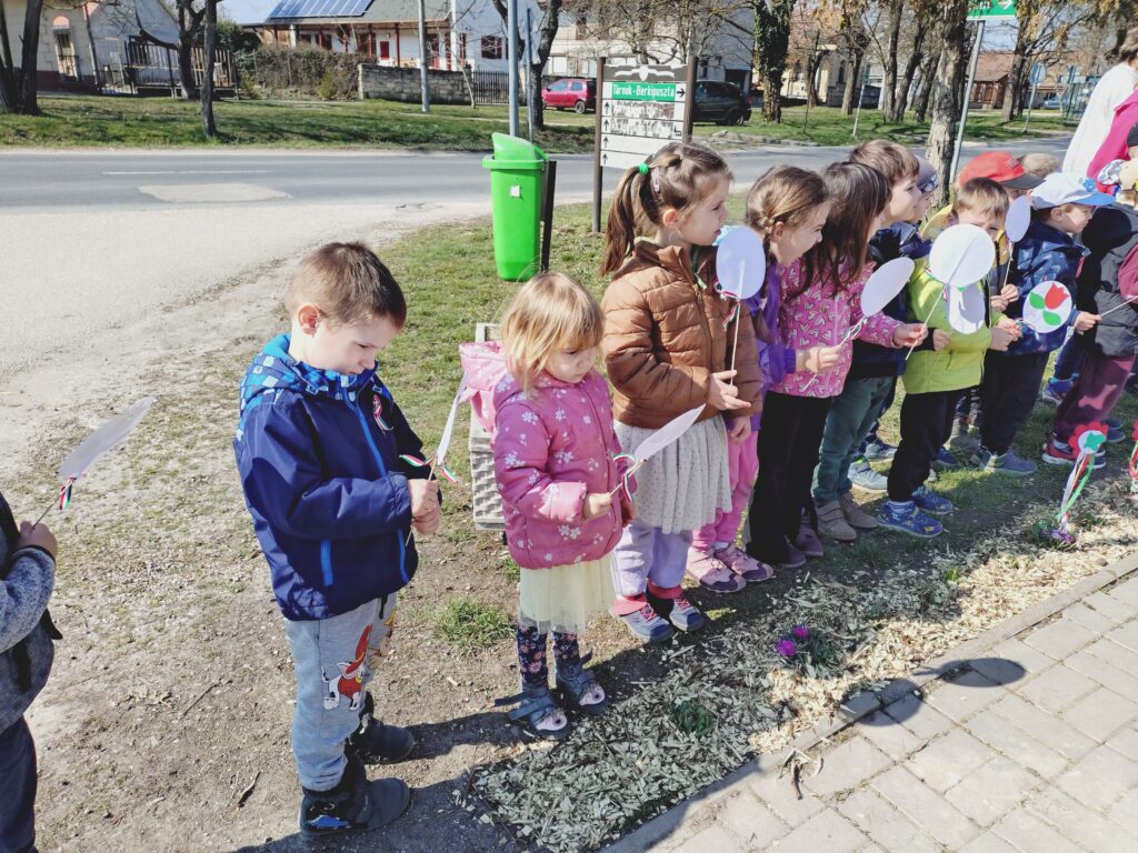 Ezek az alkotások nemcsak ügyességüket fejlesztették, hanem erősítették a nemzeti ünnephez való kötődést is. Az ünnepre minden csoport készített nemzeti színű zászlókat, virágokat, amelyeket hurkapálcára rögzítettünk. A gyermekek büszkén vitték magukkal ezeket a saját készítésű díszeket, amikor az óvoda közösen ellátogatott a település emlékművéhez. Az emlékműnél csendben, tisztelettel emlékeztünk meg a forradalom hőseiről.