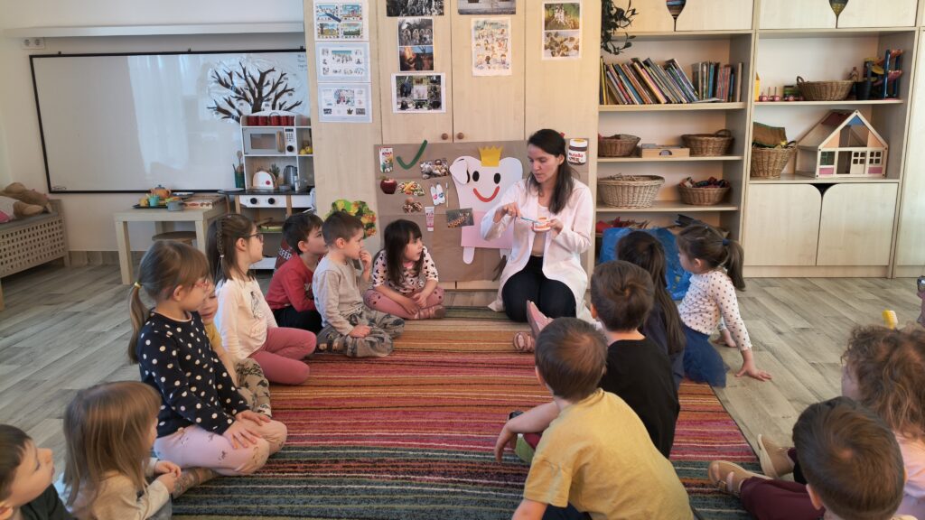 Klopfer Emma édesanyja, a fogorvos munkájáról, a helyes fogápolásról mesélt a prevenciót szem előtt tartva, interaktívan bevonva a gyerekeket az előadásába.