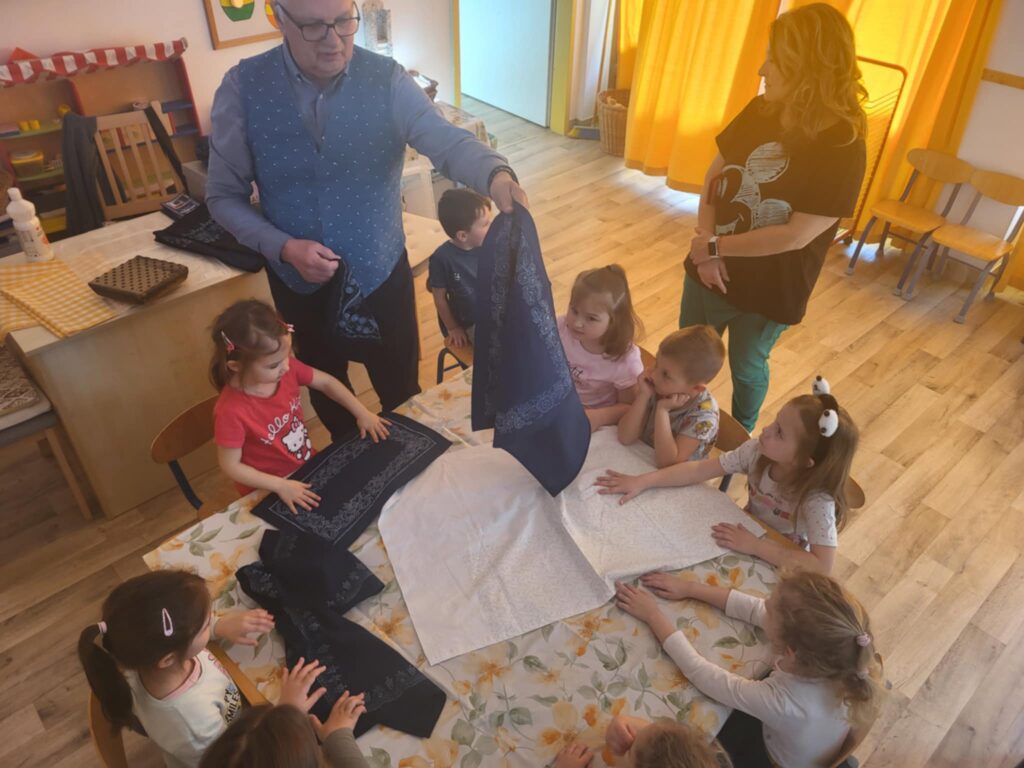Sárdi Vince nagypapája egy régi mesterséggel, a kékfestő munkájával ismertette meg a gyerekeket. Egy szép zsebkendőt is készíthettek a bemutatott nyomómintákkal, amit hazavihettek utána.